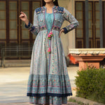 Sky-Blue Cotton Cambric Tribal Printed Maxi Dress With Jacket