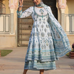 Sky-Blue Cambric Printed With Embroidery Flared Dress