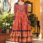 Rust Cotton Ikat Printed Layered Maxi Dress With Thread Embroidery & Dori Tassel Tie-Up At Waist
