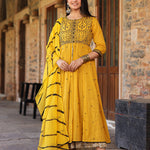 Mustard & Black Cotton Embroidered Anarkali Dress With Jacket & Tie-Dye Dupatta