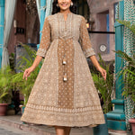 Brown Ethnic Motif Printed Georgette A-Lined Dress With Sequins & Doris