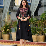 Black Thread Embroidered Liva Rayon A-Line Dress With Tassel Kaudis & Doris At Waist