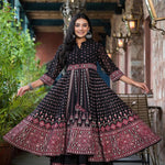 Black Ethnic Motif Printed Georgette A-Line Dress With Mirror Work & Sequins
