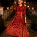 The Mahautsawam Maroon Ethnic Motif Printed Georgette Dress With Thread & Mirror Work