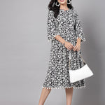 Black Floral Printed Dress - Rayon Fabric, 3/4 Sleeves, Keyhole Neck And Calf Length