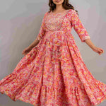 Embroidered Cotton Flared 3/4 Sleeves Ankle Length Dress