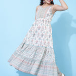 Cotton Ankle Length Printed Flared Strappy Sleeves V-Neck Dress (Preorder)