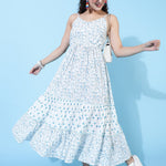 Cotton Calf Length Printed Flared Strappy Sleeves V-Neck Dress (Preorder)