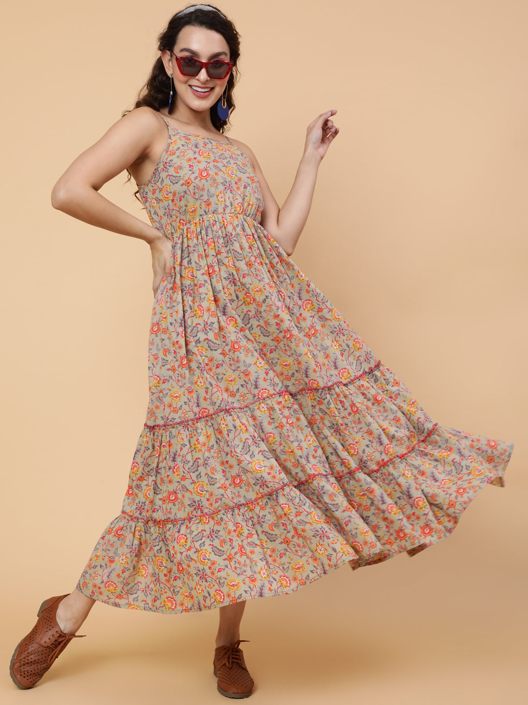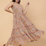 Cotton Calf Length Printed Flared Strappy Sleeves Square Neck Dress (Preorder)