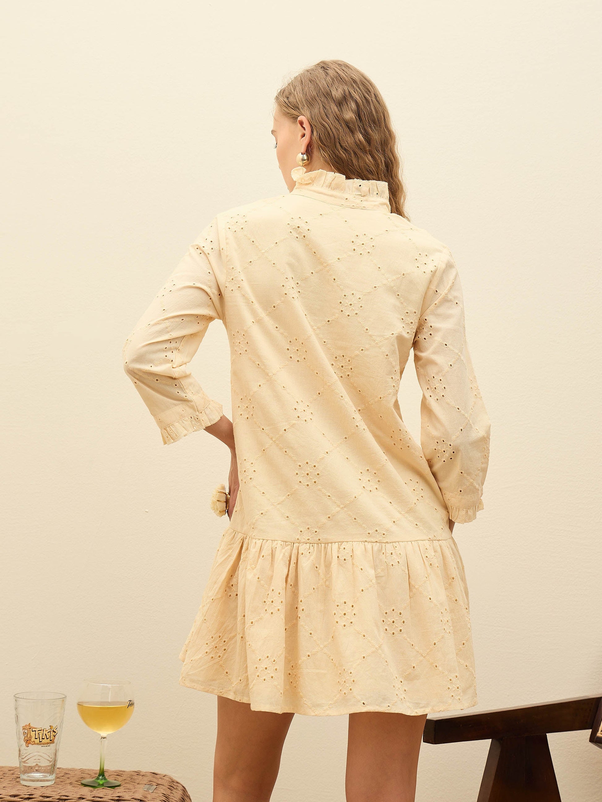 Women Ecru Schiffli frill Neck Short Dress