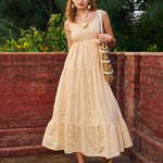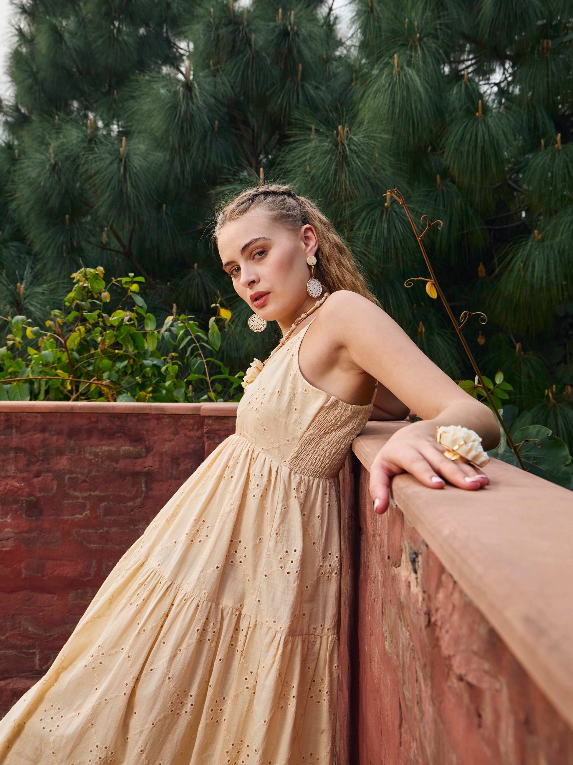 Women Ecru Schiffli V-Neck Smocked Back Strappy Midi Dress