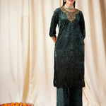 Emerald Green Embroidered Neck Straight Kurta, in Velvet fabric, Unlined, Calf Length, Straight Fit, Button Closure, Straight Hemline and features Cargo Pockets At Side