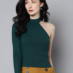 Women Emerald Green Rib One Shoulder Collar Crop Top