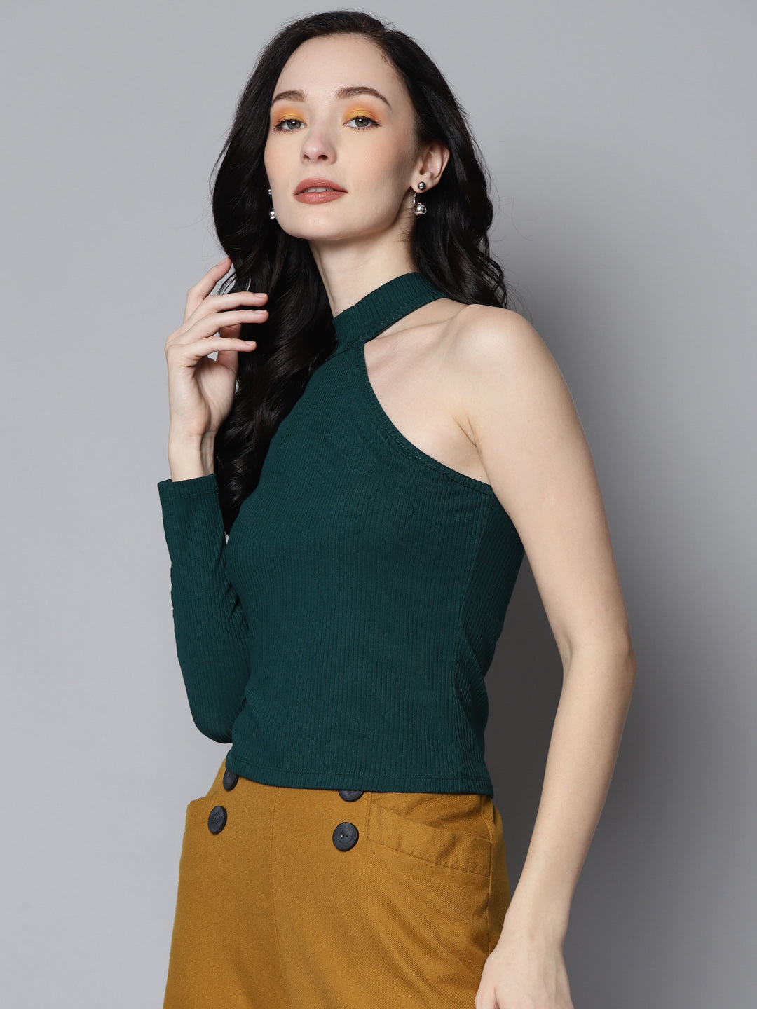 Emerald Green Rib One Shoulder Collar Crop Top, in Lycra Rib fabric, Unlined, Crop Length, Slim Fit, No Closure, Straight Hemline and features One Shoulder detail