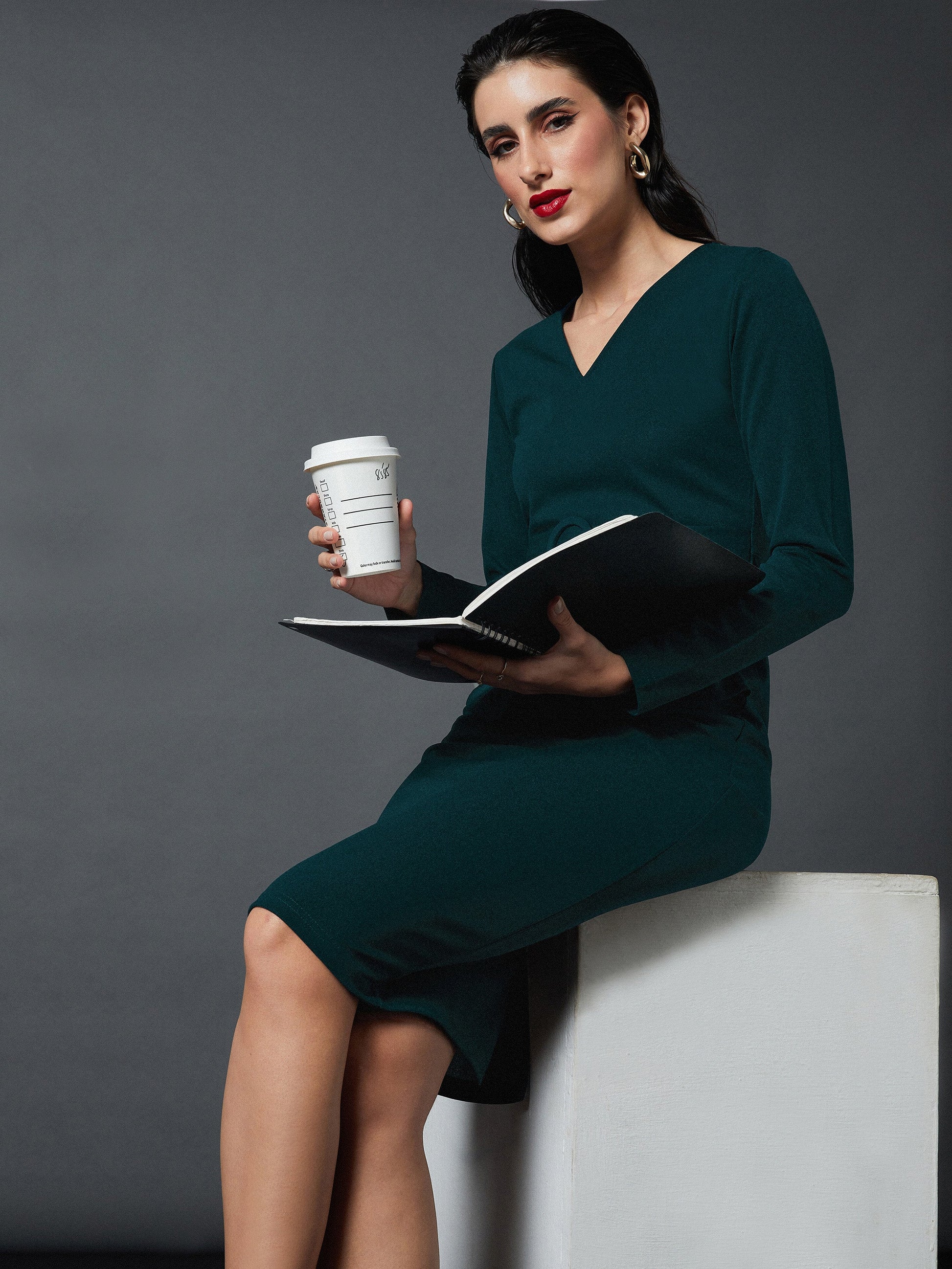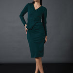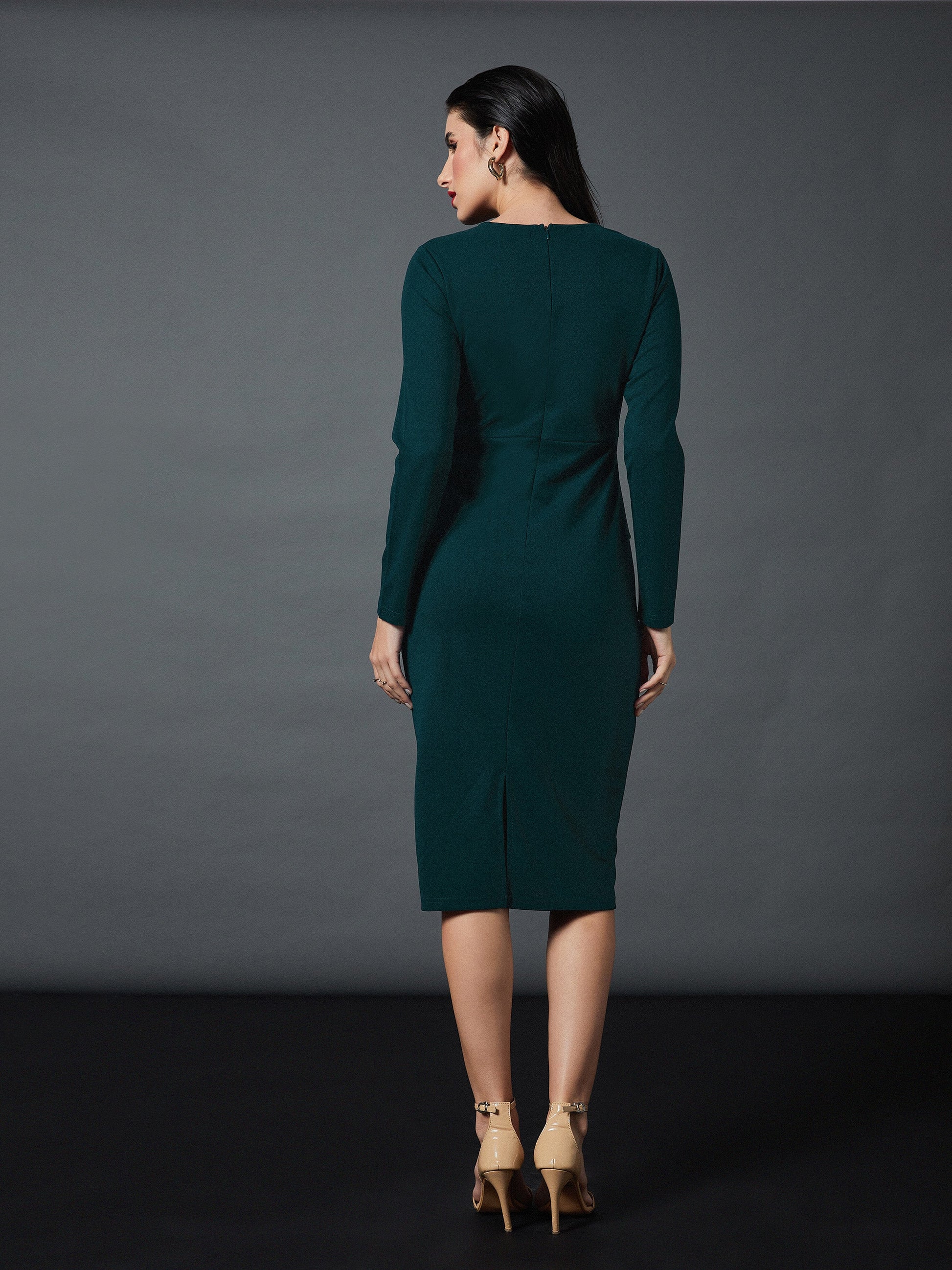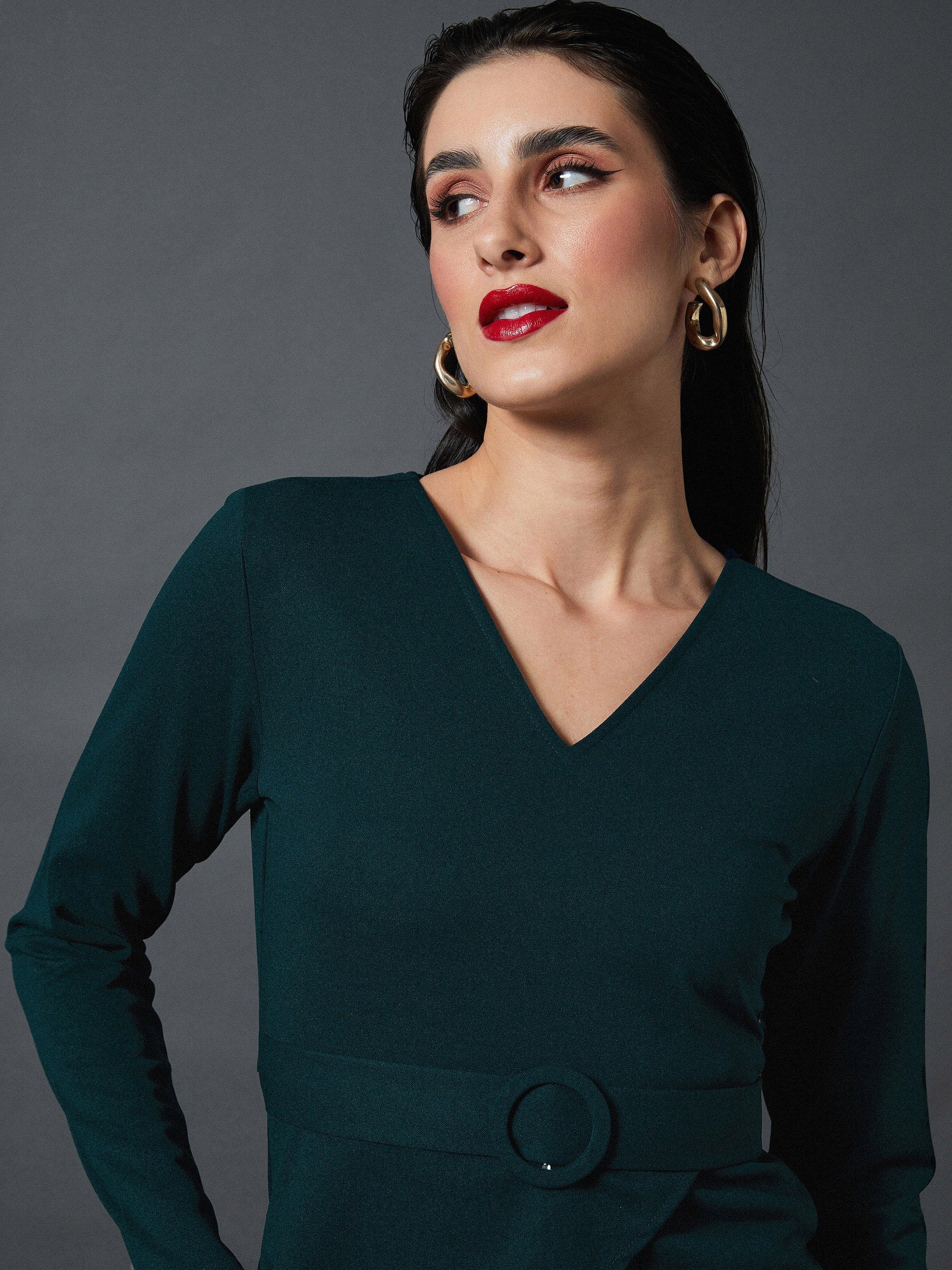 Emerald Peplum Bodycon Dress, in Canton Knit fabric, Unlined, Below Knee, Slim Fit, Zipper Closure, Straight Hemline and features Buckle Detail At Waist