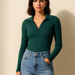 Emerald Rib Polo Style V-Neck Neck Top, in Rib fabric, Unlined, Regular Length, Slim Fit, No Closure, Straight Hemline and features Self Ribbed Design