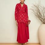 Fuchsia Foil Print Double Breasted Blazer With Gathered Skirt, in Cotton Poplin fabric, Unlined, Regular Length , Comfort Fit, Button Closure, Straight Hemline and features Button Detail At Front