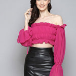 Fuchsia Off Shoulder Ruched Crop Top, in Weightless Georgette fabric, Polyknit , Crop Length, Comfort Fit, No Closure, Straight Hemline and features Ruching All Over