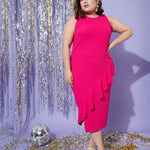 Fuchsia One Side Frill Bodycon Dress, in Karera Crepe fabric, Unlined, Midi Length, Body Con Fit, Zipper Closure, Straight Hemline and features Frill Detail At Side