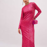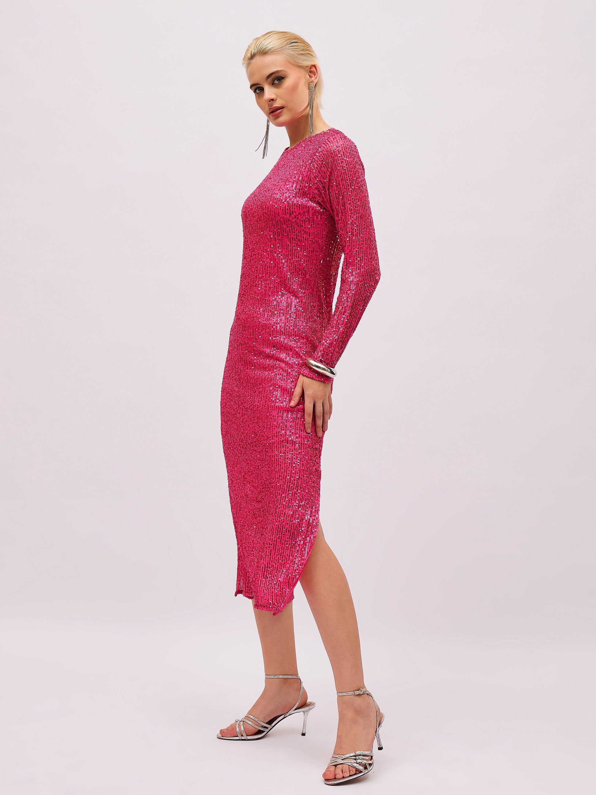 Fuchsia Sequin Round Neck Side Slit Midi Dress, in Sequin Net fabric, Polyknit, Midi Length, Slim Fit, No Closure, Straight Hemline and features Slit Detail At Both Side