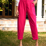 Fuchsia Stretch Knit Tapered Pants , in Canton Knit fabric, Unlined, Ankle Length, Comfort Fit, Button Closure, Straight Hemline and features Pleats Detail At Front