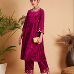 Women Fuchsia Velvet Embroidered Gathered Kurta