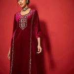 Women Fuchsia Velvet Embroidered Round Neck Kurta