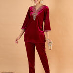 Women Fuchsia Velvet Embroidered Short Kurta With Pencil Pants