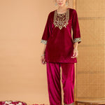 Women Fuchsia Velvet Embroidered Short Kurta With Straight Pants