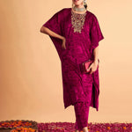 Fuchsia Velvet Kaftan Kurta, in Velvet fabric, Unlined, Midi Length, Comfort Fit, Straight Hemline and features Embroidery Detail At Neck