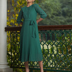 Women Green Accordion Pleated Belted Midi Dress