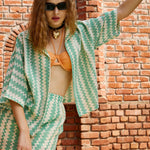 Green & Beige Chevron Stripe Oversized Shirt, in Lace Fabric fabric, Unlined, Regular Length, Comfort Fit, Button Closure, Straight Hemline and features Button At Front