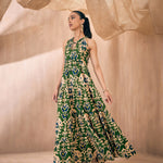 Green & Beige Ikat Print Dori Neck Tiered Maxi, in Cotton Cambric fabric, Cotton Voile, Maxi Length, Fit & Flare, Zipper Closure, Flared Hemline and features Dori Detail At Front Neck