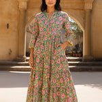 Green Floral Button Down Tiered Maxi Dress, in Cotton Cambric fabric, Cotton Voile, Maxi Length , Comfort Fit, Button Closure, Flared Hemline and features Lace Detail At Hem