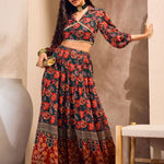 Women Green Floral Collar Crop Top With Anarkali Skirt