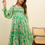 Green Floral Square Neck Midi Dress, in Georgette fabric, Poly Knit Lining, Below Knee, Fit & Flare, NA, Flared Hemline and features Frill Detail At Neck