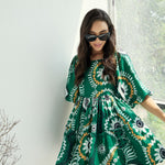 Green Floral Square-Neck Short Dress , in Cotton Poplin fabric, Cotton Voile, Above Knee, Fit & Flare , No Closure, Flared Hemline and features Smocking Detail At Back