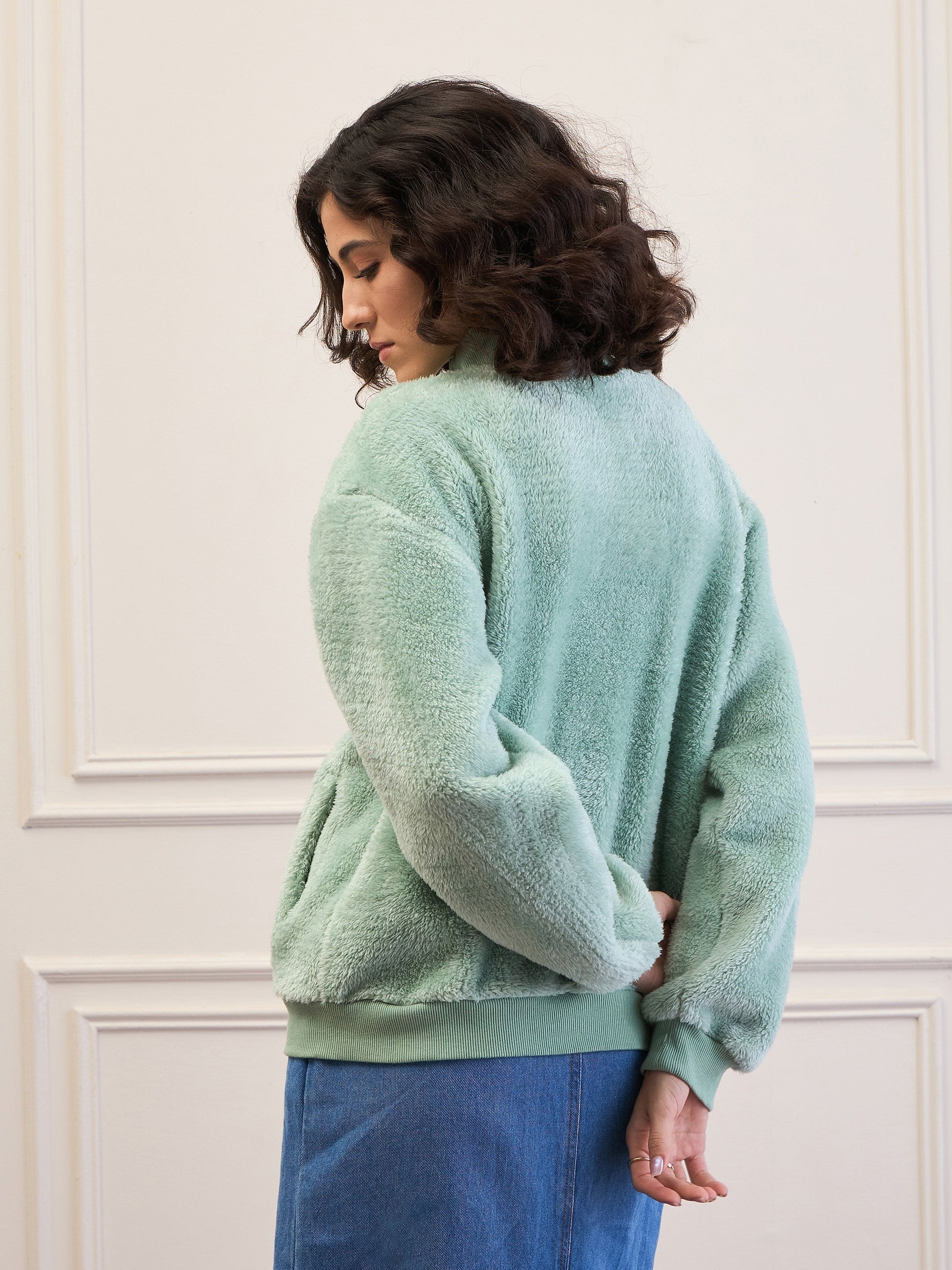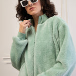 Green Fur High Neck Front Zipper Jacket, in Double Side Fur fabric, Unlined, Regular Length, Comfort Fit, Zipper Closure, Straight Hemline and features Zipper At Front