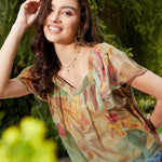 Green Jungle Print Sweetheart Neck Top, in Chiffon fabric, Polycrepe, Regular Length, Comfort Fit, NA, Straight Hemline and features Sweetheart Neck