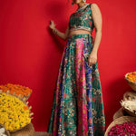 Women Green Multi Floral Anarkali Skirt With Crop Top