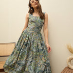 Green Paisley Strappy Midi Dress, in Summercool fabric, Polyknit Lining, Below Knee, Fit & Flare, Slip On , Flared Hemline and features Down Waist Detail At Front