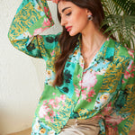 Green Placement Floral Oversize Shirt, in Satin Chiffon fabric, Unlined, Regular Length, Oversize Fit, Button Closure, Straight Hemline and features Slit At Sides