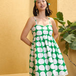Green Polka Dot Strappy Short Dress, in Cotton Cambric fabric, Cotton Voile, Above Knee, Fit & Flare, Zipper Closure, Flared Hemline and features Lace Detail At Bottom