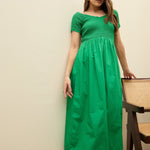 Green Poplin Smocked Midi Dress, in Poplin fabric, Unlined, Below Knee, Fit & Flare, NA, Flared Hemline and features Smocking At Chest