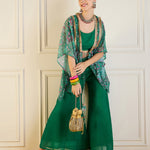 Green Printed Cape With Flared Pants & Crop Top, in Georgette fabric, Butter Crepe Lining, Crop Length, Comfort Fit/ Fit & Flare, Zipper Closure, Straight Hemline and features Dori Detail At Cape Front
