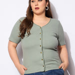 Green Rib Front Button Lace Detail Top , in Rib fabric, Unlined, Regular Length , Comfort Fit , Button Closure, Straight Hemline and features Metal Button Detail At Front