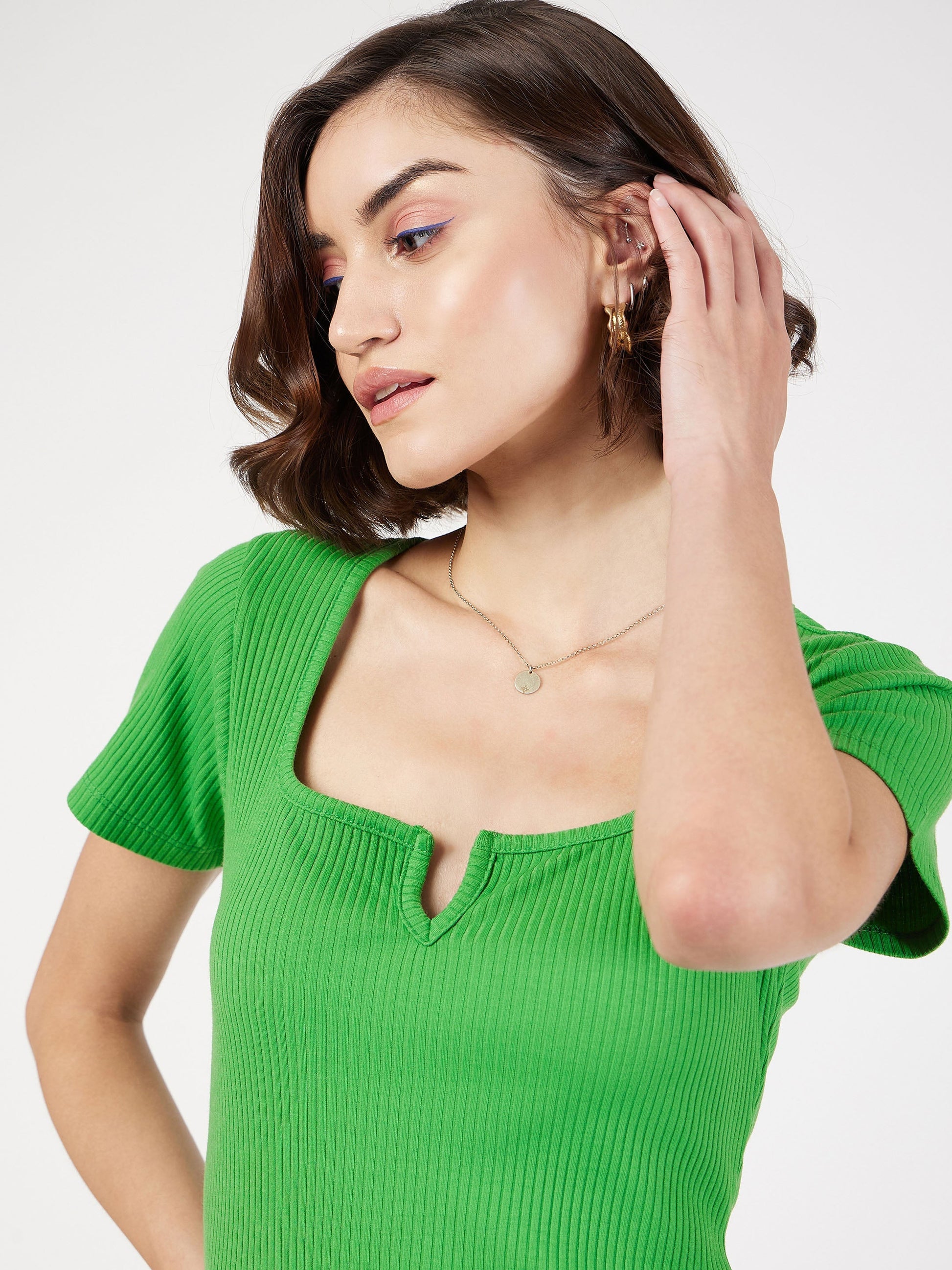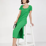 Green Rib V-Neck Midi Dress, in Rib fabric, Unlined, Below Knee, Slim Fit, No Closure, Straight Hemline and features Button At Front
