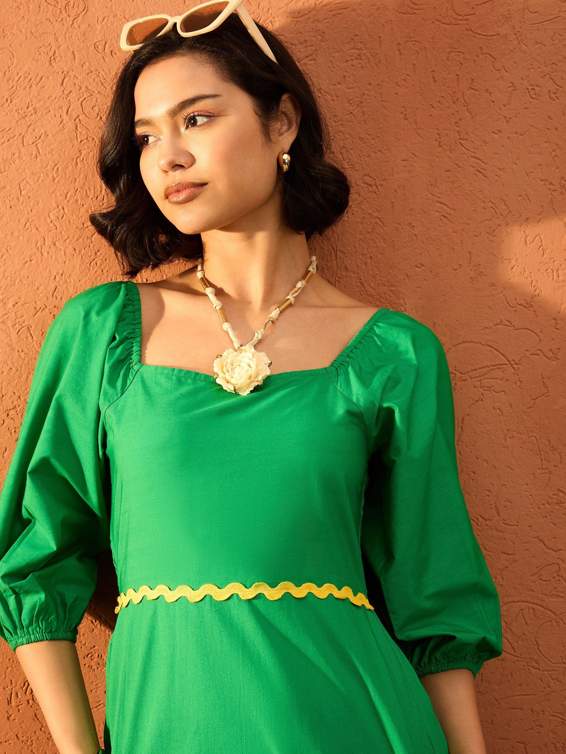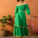 Green Ric Rac Lace Square Neck Maxi Dress, in Cotton Poplin fabric, Unlined, Maxi Length, Comfort Fit, No Closure, Flared Hemline and features Ric Rac Lace Detail