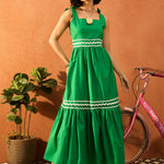 Green Ric Rac Lace Strappy Tiered Midi Dress, in Cotton Poplin fabric, Unlined, Midi Length, Comfort Fit, Tie Up Closure, Flared Hemline and features Ric Rac Lace Detail