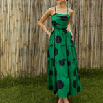 Green Strappy Back Cut-Out Polka Maxi, in Cotton Poplin fabric, Cotton Voile, Maxi Length, Fit & Flare , No Closure, Flared Hemline and features Smoking Detail At Back